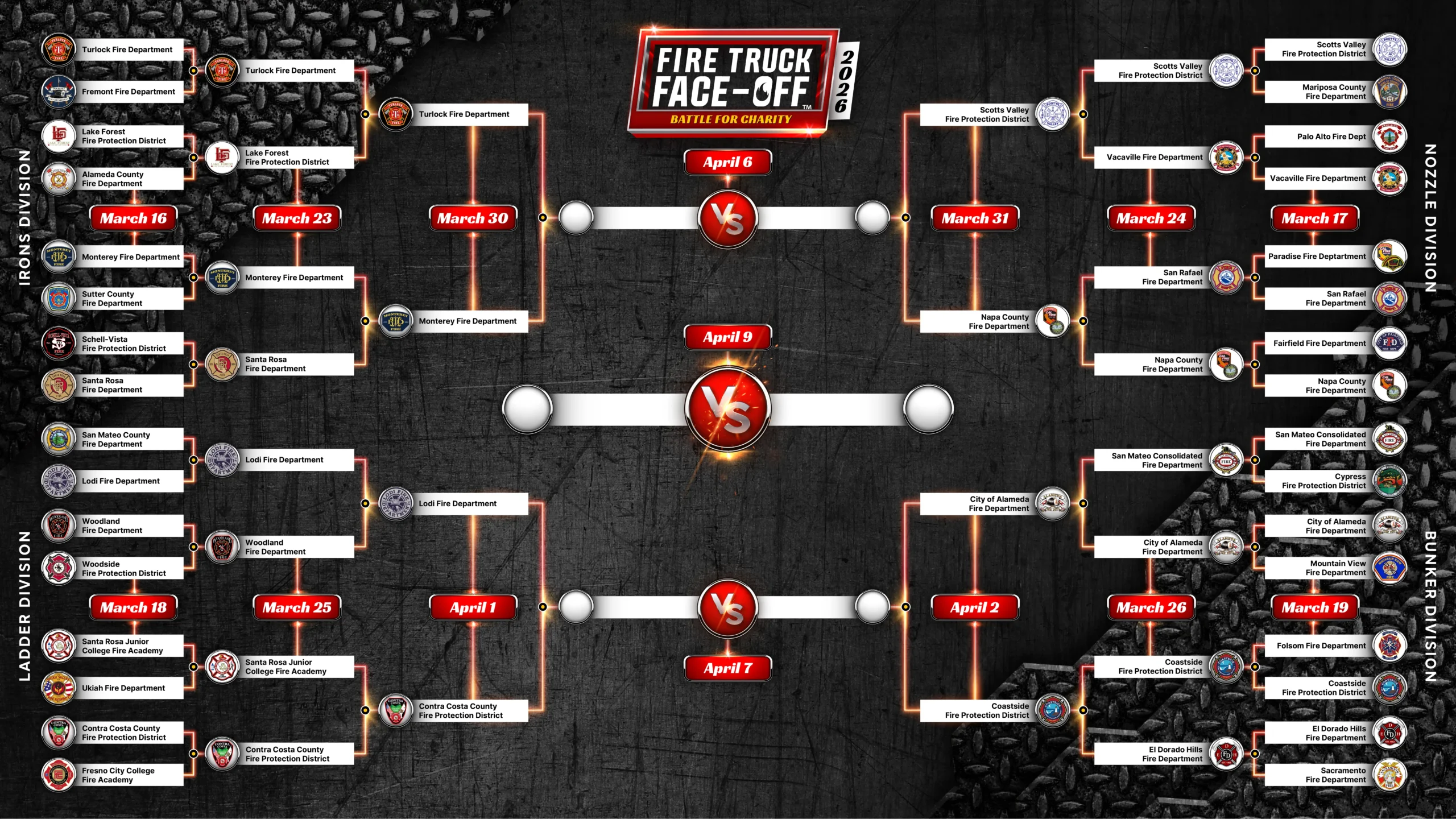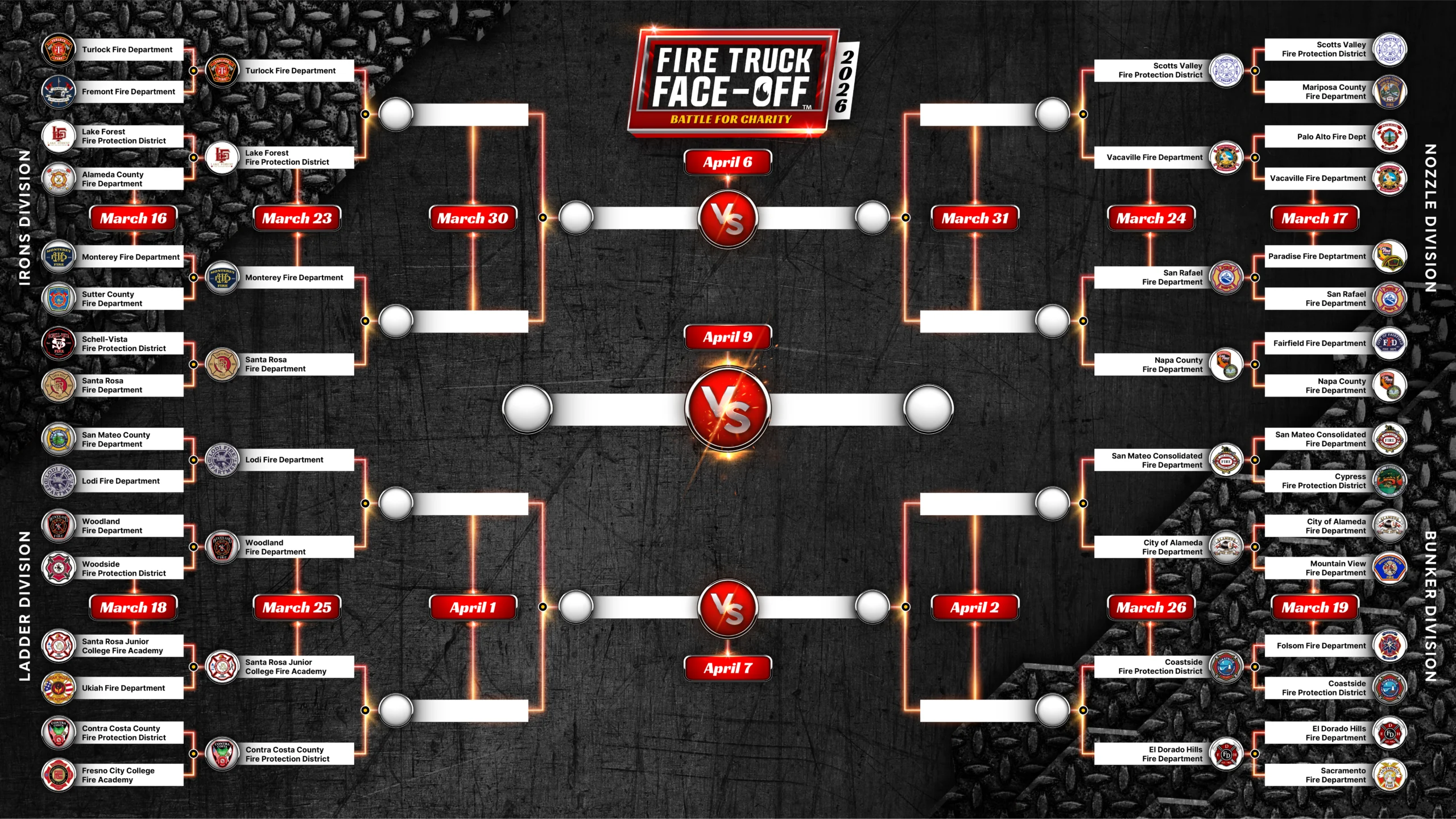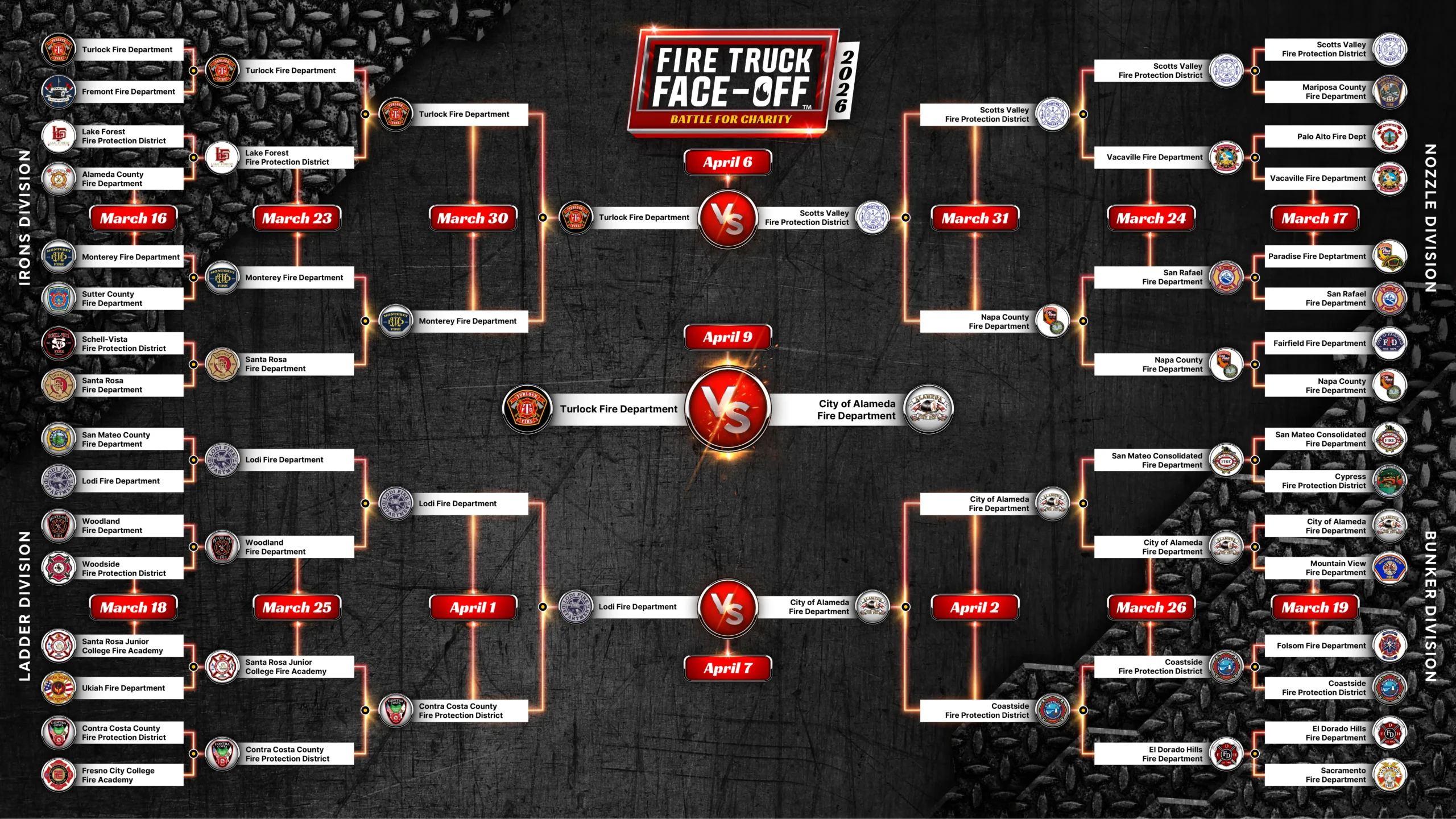 This years 32 participating departments were randomly selected from qualifying vehicles, and sorted into the four following brackets: Irons, Nozzle, Ladder, Bunker. If your department is participating, be aware of when your match takes place. The tournament brackets will be updated throughout the tournament.